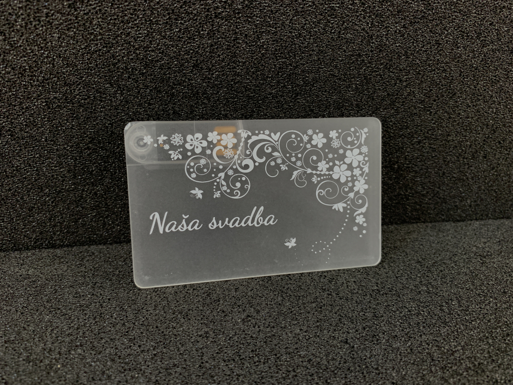 USB KARTA "Naša svadba" plast 2.0 + box - plastové USB v tvare kreditnej karty s otočným konektorom a so svadobným motívom a vytlačeným nápisom "Naša svadba", je veľmi vhodný darček pre novomanželov alebo svadobných hostí. USB je uložené v priehľadom plastovom obale, ktorý sa uzatvára na magnet. Telo USB aj obal sú vyrobené z kvalitného plastu.
